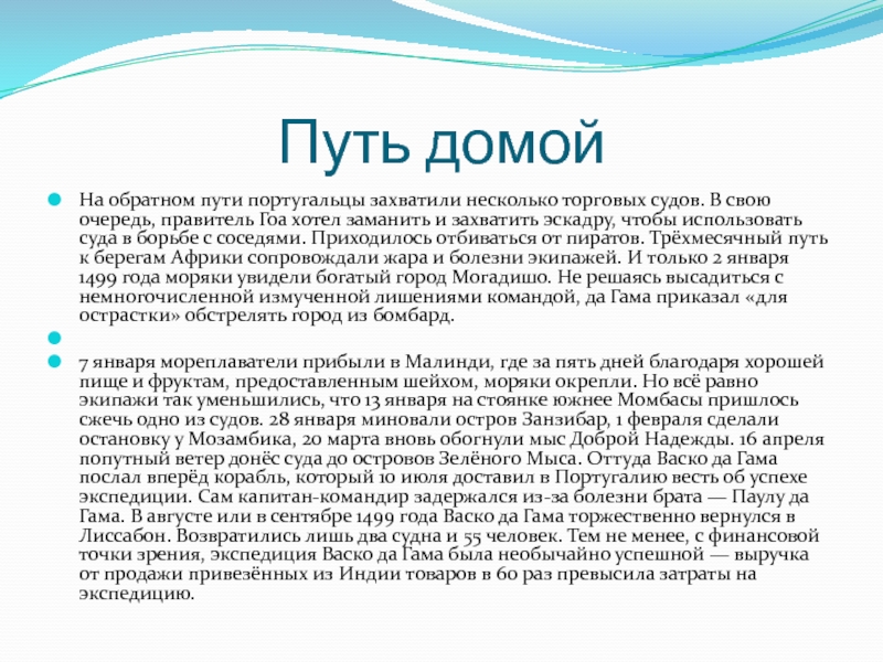 использовать суда в борьбе с соседями. Приходилось отбиваться от пиратов. Трёхмесячный путь к берегам Африки сопровождали жара и болезни экипажей. И только 2 января 1499 года моряки увидели богатый город Могадишо. Не решаясь высадиться с немногочисленной измученной лишениями командой, да Гама приказал «для острастки» обстрелять город из бомбард.