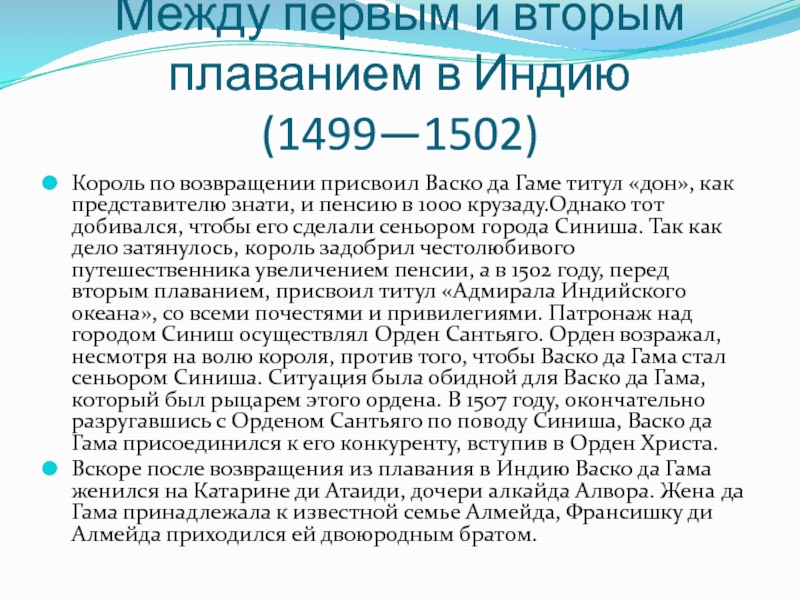 пенсию в 1000 крузаду.Однако тот добивался, чтобы его сделали сеньором города Синиша. Так как дело затянулось, король задобрил честолюбивого путешественника увеличением пенсии, а в 1502 году, перед вторым плаванием, присвоил титул «Адмирала Индийского океана», со всеми почестями и привилегиями. Патронаж над городом Синиш осуществлял Орден Сантьяго. Орден возражал, несмотря на волю короля, против того, чтобы Васко да Гама стал сеньором Синиша. Ситуация была обидной для Васко да Гама, который был рыцарем этого ордена. В 1507 году, окончательно разругавшись с Орденом Сантьяго по поводу Синиша, Васко да Гама присоединился к его конкуренту, вступив в Орден Христа.