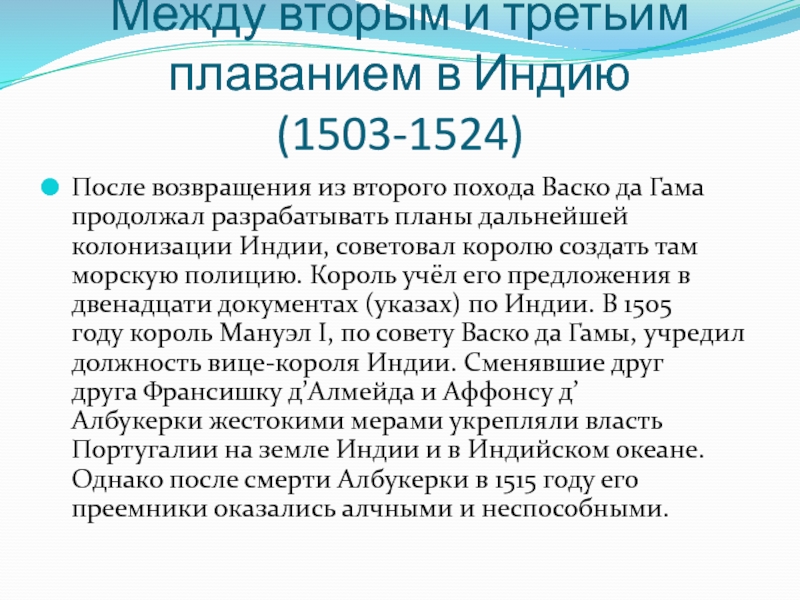 Слайд 9Между вторым и третьим плаванием в Индию (1503-1524)