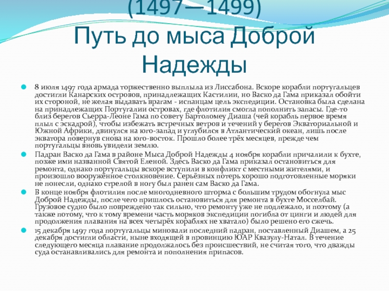 островов, принадлежащих Кастилии, но Васко да Гама приказал обойти их стороной, не желая выдавать врагам - испанцам цель экспедиции. Остановка была сделана на принадлежащих Португалии островах, где флотилия смогла пополнить запасы. Где-то близ берегов Сьерра-Леоне Гама по совету Бартоломеу Диаша (чей корабль первое время плыл с эскадрой), чтобы избежать встречных ветров и течений у берегов Экваториальной и Южной Африки, двинулся на юго-запад и углубился в Атлантический океан, лишь после экватора повернув снова на юго-восток. Прошло более трёх месяцев, прежде чем португальцы вновь увидели землю.