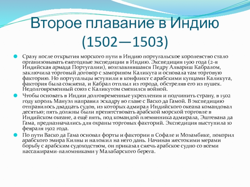 (2-я Индийская армада Португалии), возглавлявшаяся Педру Алвариш Кабралом, заключила торговый договор с заморином Каликута и основала там торговую факторию. Но португальцы вступили в конфликт с арабскими купцами Каликута, фактория была сожжена, и Кабрал отплыл из города, обстреляв его из пушек. Недолговременный союз с Каликутом сменился войной.