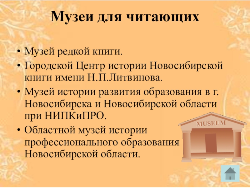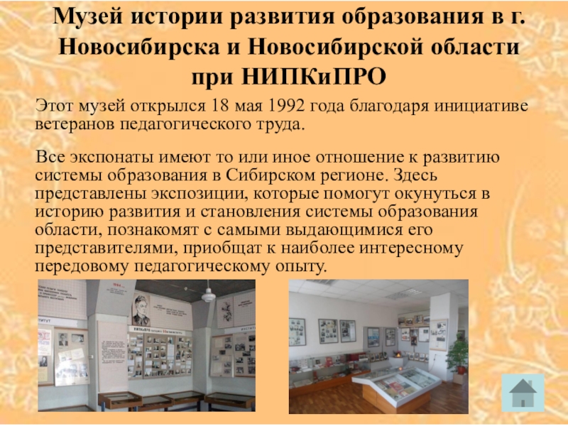 Слайд 19Музей истории развития образования в г.Новосибирска и Новосибирской области при