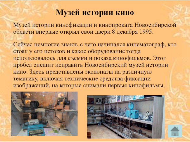 начинался кинематограф, кто стоял у его истоков и какое оборудование тогда использовалось для съемки и показа кинофильмов. Этот пробел спешит исправить Новосибирский музей истории кино. Здесь представлены экспонаты на различную тематику, включая технические средства фиксации изображений, на которые снимали первые кинофильмы.