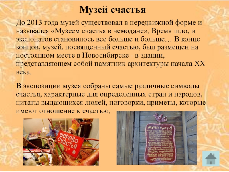 все больше и больше… В конце концов, музей, посвященный счастью, был размещен на постоянном месте в Новосибирске - в здании, представляющем собой памятник архитектуры начала XX века.