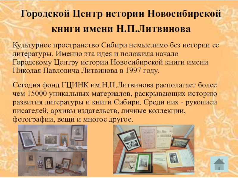 Сегодня фонд ГЦИНК им.Н.П.Литвинова располагает более чем 15000 уникальных материалов, раскрывающих историю развития литературы и книги Сибири. Среди них - рукописи писателей, архивы издательств, личные коллекции, фотографии, вещи и многое другое.