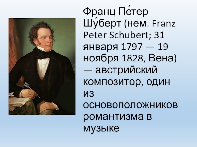 Слайд 4Франц Пе́тер Шу́берт (нем. Franz Peter Schubert; 31 января 1797