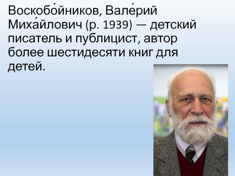 Слайд 3Воскобо́йников, Вале́рий Миха́йлович (р. 1939) — детский писатель и публицист,