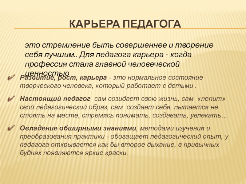 это стремление быть совершеннее и творение себя лучшим.. Для педагога карьера - когда профессия стала главной человеческой ценностью