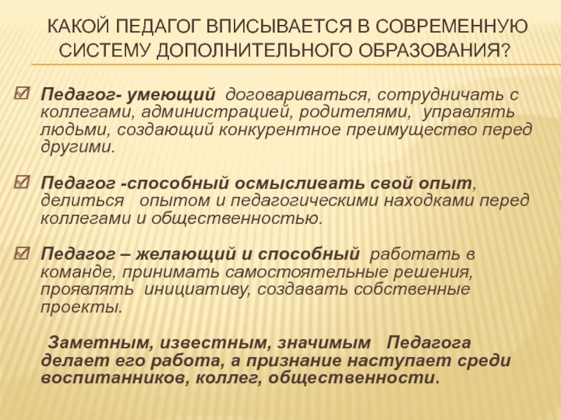 Слайд 11 Какой педагог вписывается в современную систему дополнительного образования?