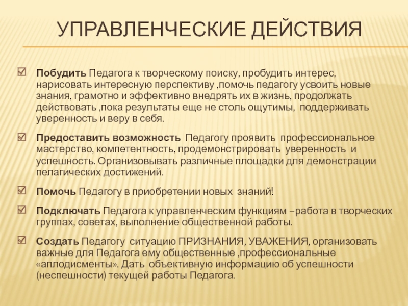 Подключать Педагога к управленческим функциям –работа в творческих группах, советах, выполнение общественной работы.