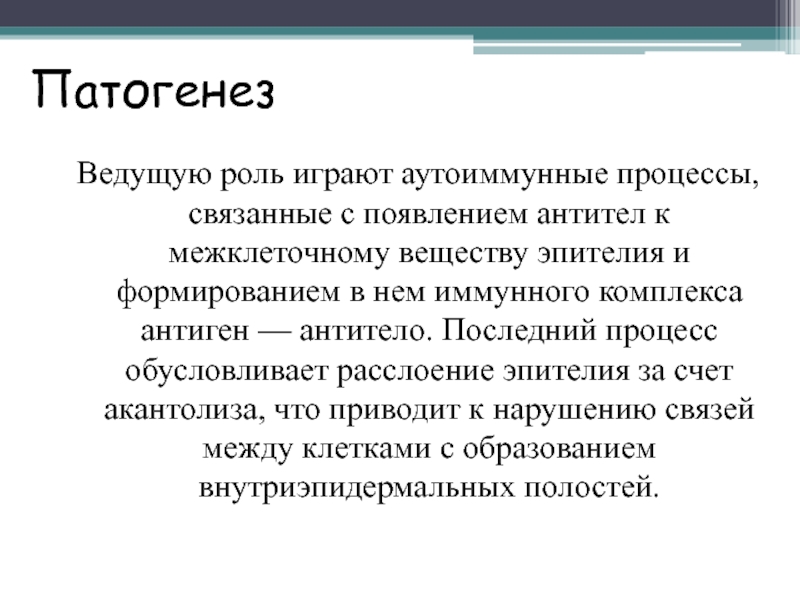 ПатогенезВедущую роль играют аутоиммунные процессы, связанные с появлением антител к межклеточному веществу эпителия и формированием в нем