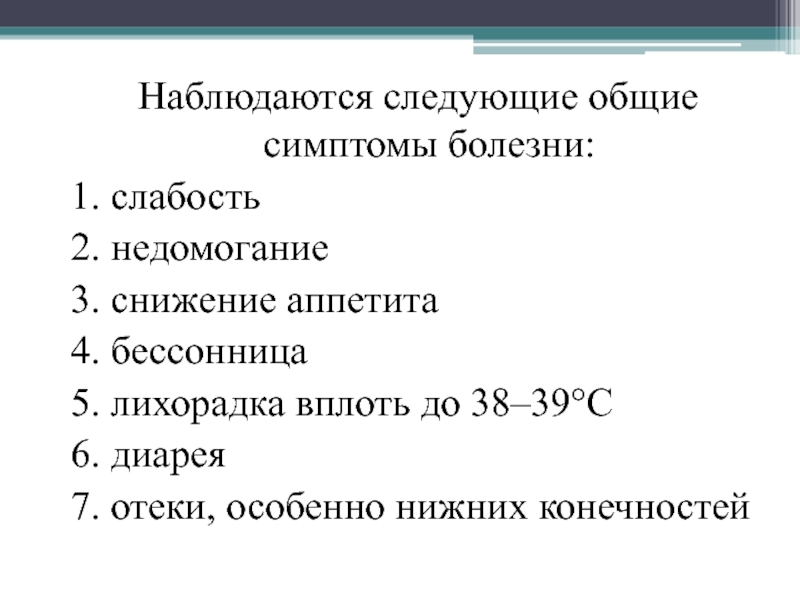 Наблюдаются следующие общие симптомы болезни: 1. слабость2. недомогание3. снижение аппетита4. бессонница5. лихорадка вплоть до 38–39°С6. диарея7. отеки,
