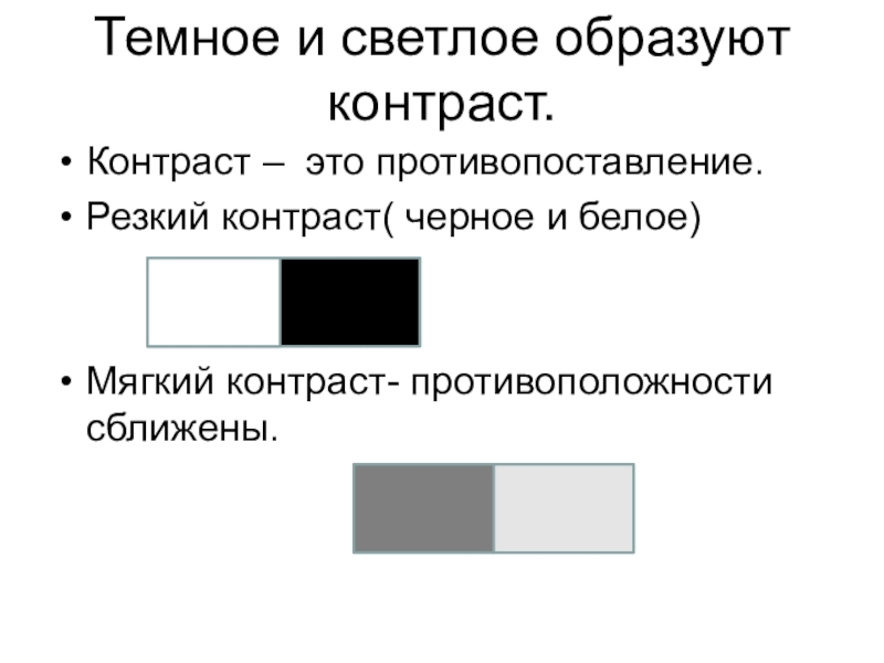 Темное и светлое образуют контраст.Контраст – это противопоставление.Резкий контраст( черное и белое)Мягкий контраст- противоположности сближены.