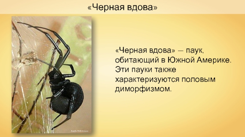 «Черная вдова»Angela Rothermann«Черная вдова» — паук, обитающий в Южной Америке.Эти пауки также характеризуются половым диморфизмом.