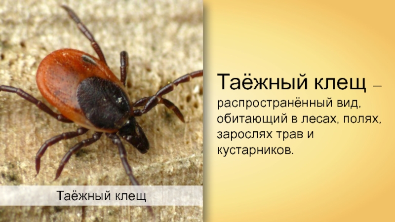 WWalasТаёжный клещТаёжный клещ —распространённый вид, обитающий в лесах, полях, зарослях трав и кустарников.