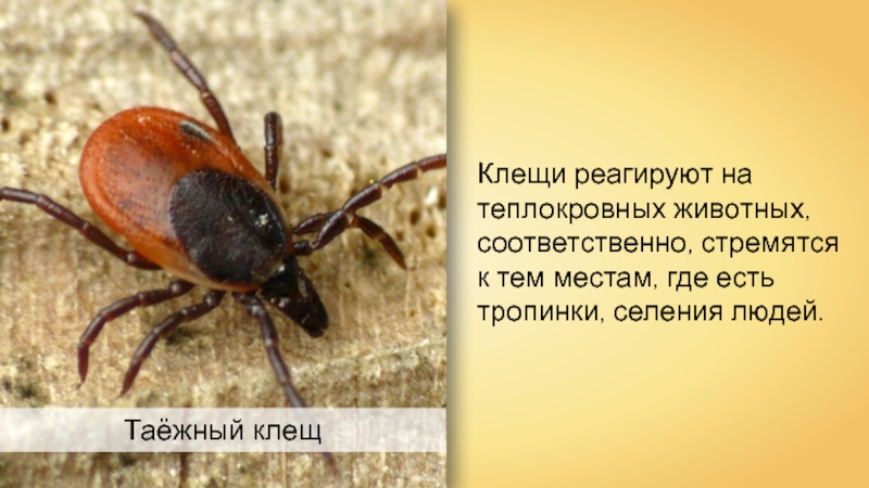 WWalasТаёжный клещКлещи реагируют на теплокровных животных, соответственно, стремятся к тем местам, где есть тропинки, селения людей.