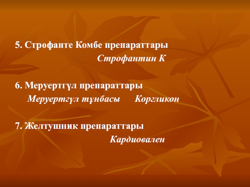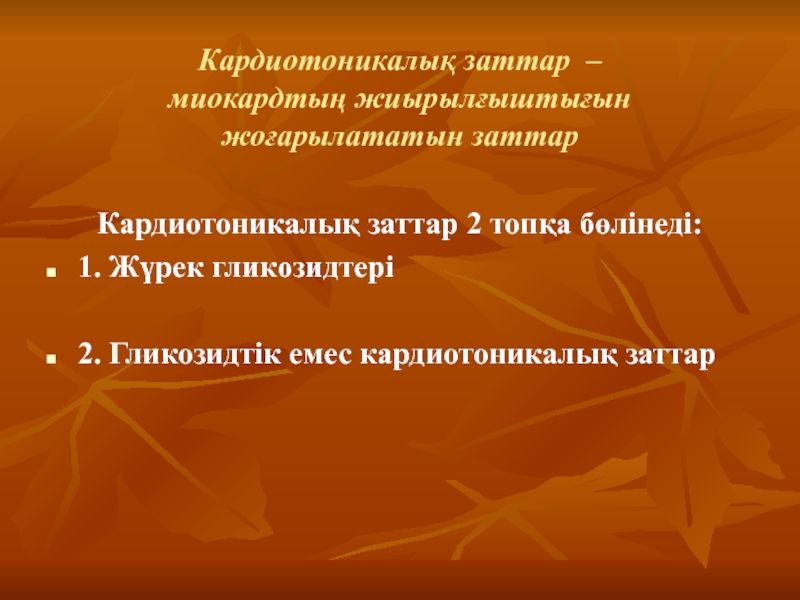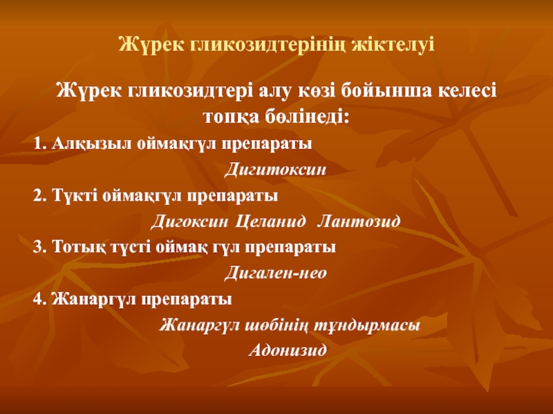Слайд 11Жүрек гликозидтері - кардиотоникалық әсер көрсететін, негізінен өсімдік тектес препараттар.
