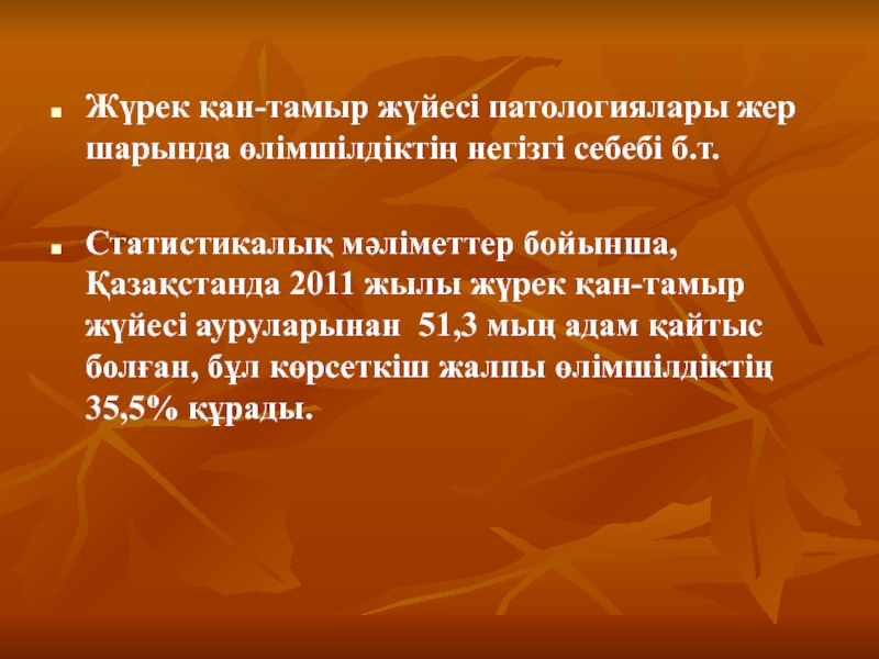 Слайд 2Жүрек қан-тамыр жүйесі патологиялары жер шарында өлімшілдіктің негізгі себебі б.т.