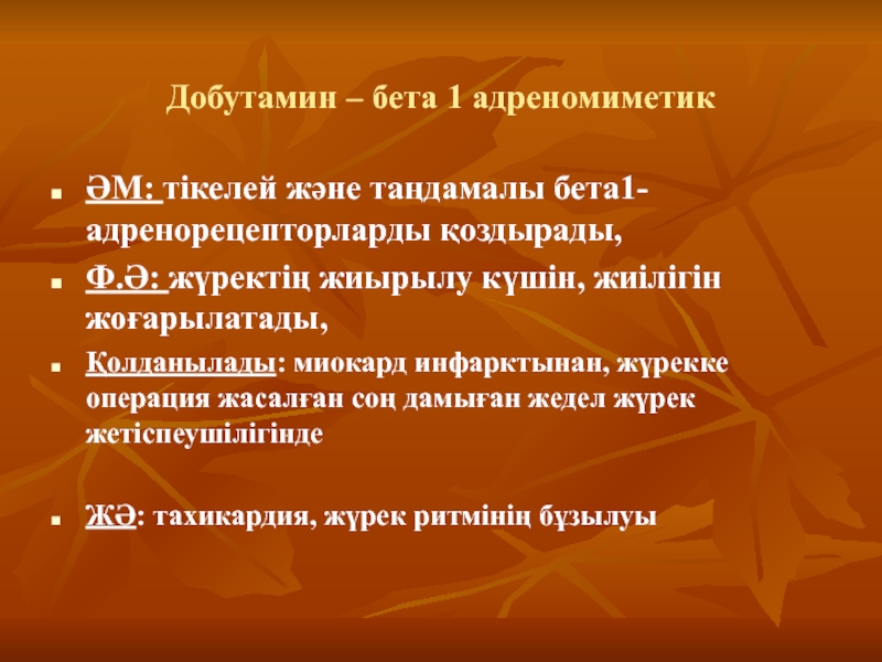 ӘМ: тікелей және таңдамалы бета1-адренорецепторларды қоздырады,
