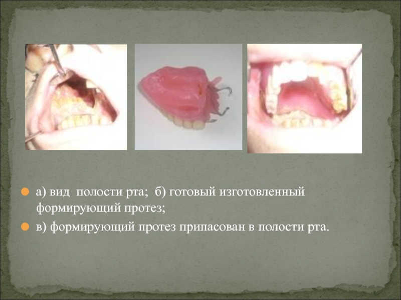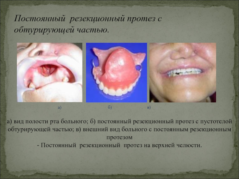 а) после операции; б) резекционный протез с пустотелой обтурирующей частью; в) резекционный протез припасован на верхней челюсти;