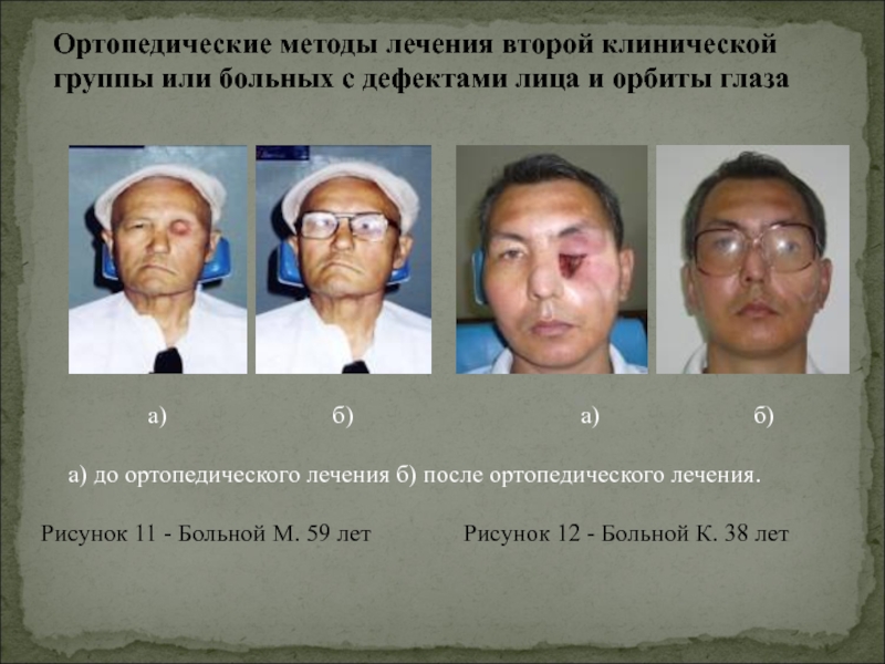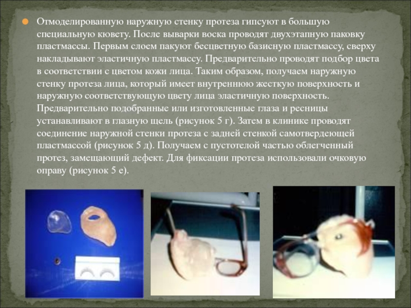 а) больной после операции; б) этап соединения задней и наружной стенки эктопротеза; в) эктопротез зафиксирован на очковой оправе
