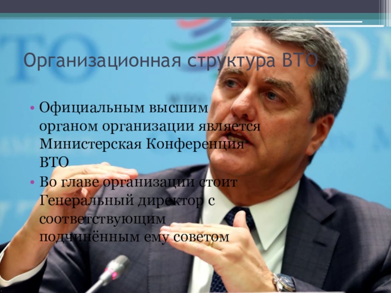 Организационная структура ВТО Официальным высшим органом организации является Министерская Конференция ВТОВо главе организации стоит Генеральный директор с