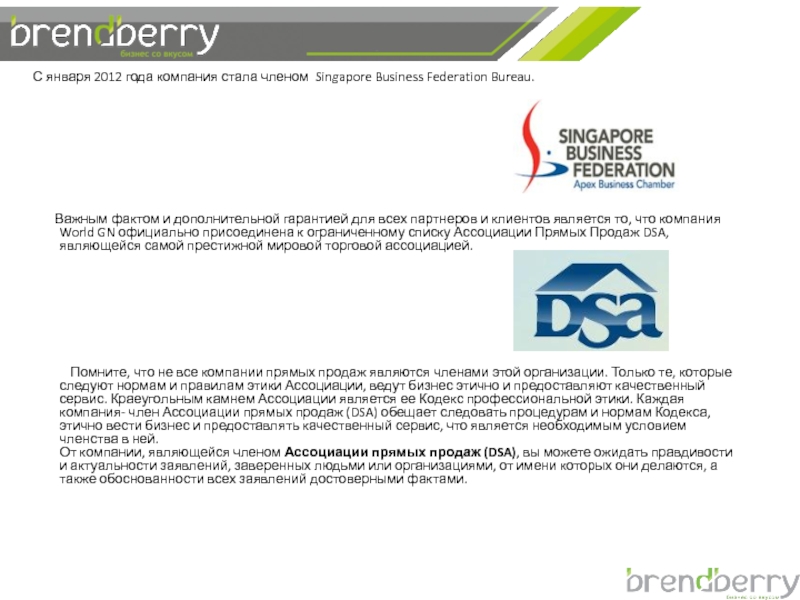 и дополнительной гарантией для всех партнеров и клиентов является то, что компания World GN официально присоединена к ограниченному списку Ассоциации Прямых Продаж DSA, являющейся самой престижной мировой торговой ассоциацией.