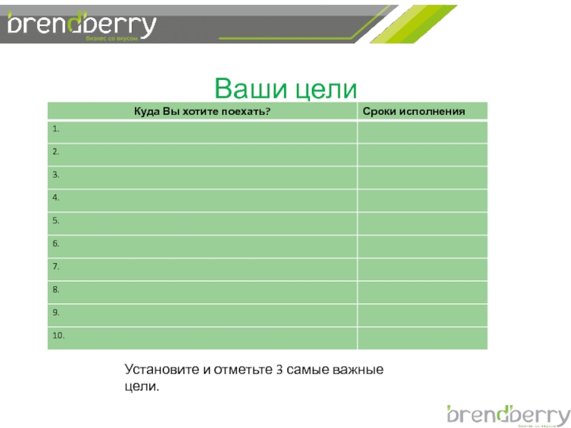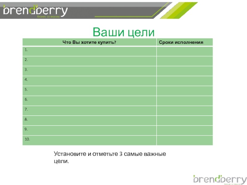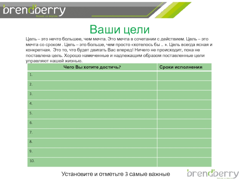– это больше, чем просто «хотелось бы .. ». Цель всегда ясная и конкретная. Это то, что будет двигать Вас вперед! Ничего не происходит, пока не поставлена цель. Хорошо намеченные и надлежащим образом поставленные цели управляют нашей жизнью.
