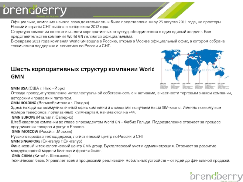 Структура компании состоит из шести корпоративных структур, объединенных в один единый холдинг. Все представительства компании World GN являются официальными.
