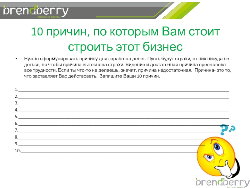 не деться, но чтобы причина вытесняла страхи. Видение и достаточная причина преодолеют все трудности. Если ты что-то не делаешь, значит, причина недостаточная. Причина- это то, что заставляет Вас действовать. Запишите Ваши 10 причин.