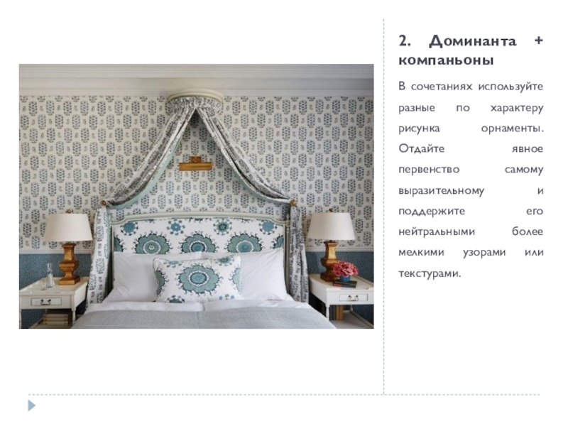 2. Доминанта + компаньоныВ сочетаниях используйте разные по характеру рисунка орнаменты. Отдайте явное первенство самому выразительному и