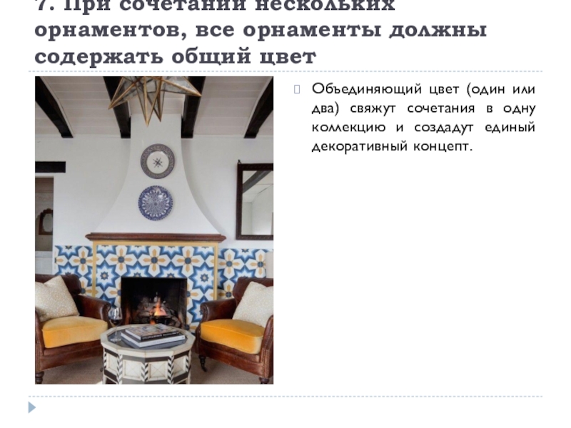 7. При сочетании нескольких орнаментов, все орнаменты должны содержать общий цветОбъединяющий цвет (один или два) свяжут сочетания