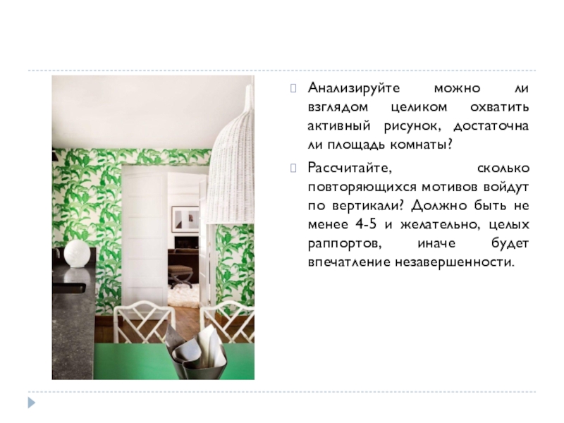 Анализируйте можно ли взглядом целиком охватить активный рисунок, достаточна ли площадь комнаты? Рассчитайте, сколько повторяющихся мотивов войдут по