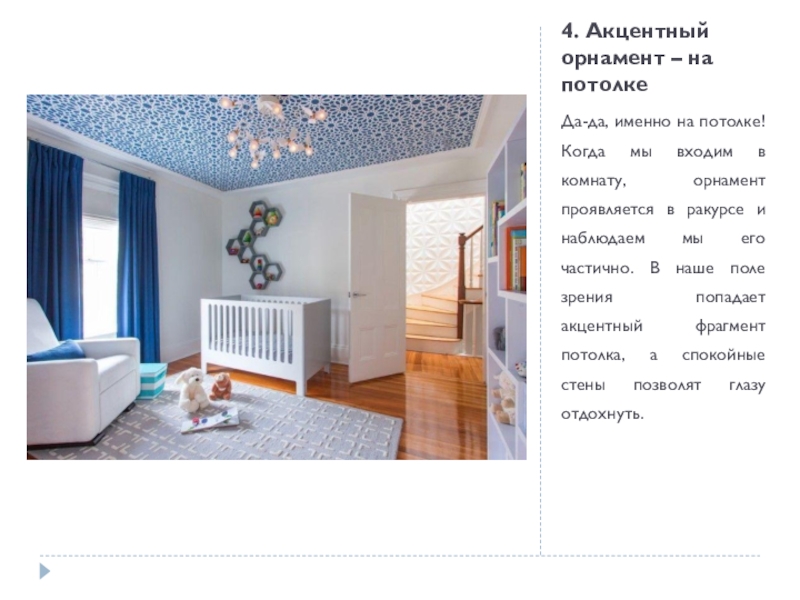 4. Акцентный орнамент – на потолкеДа-да, именно на потолке! Когда мы входим в комнату, орнамент проявляется в