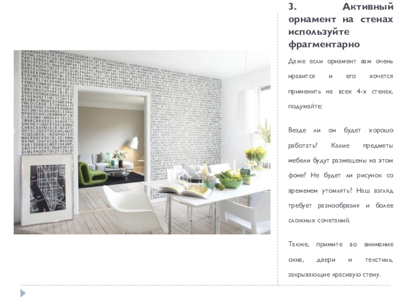 Слайд 53. Активный орнамент на стенах используйте фрагментарно