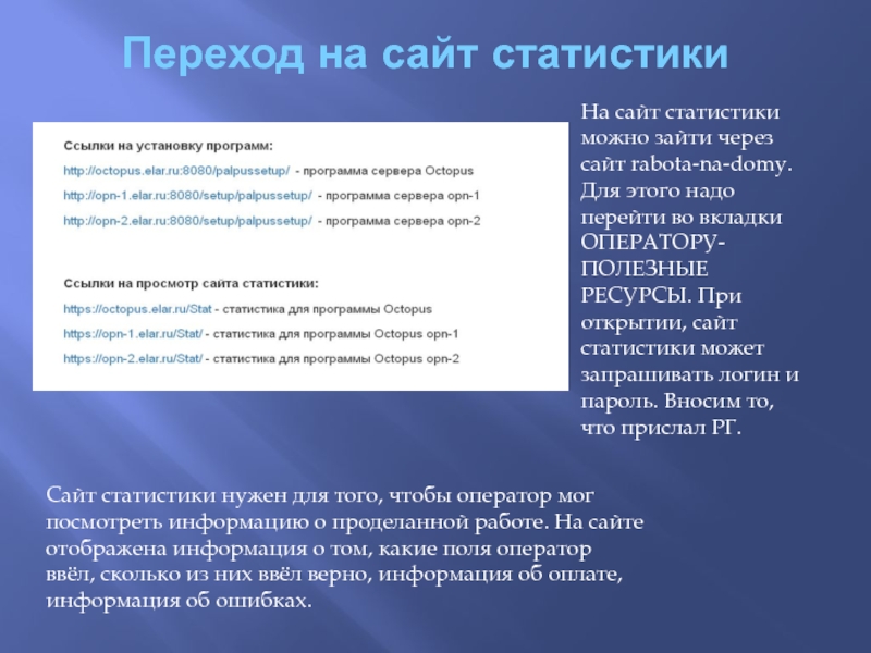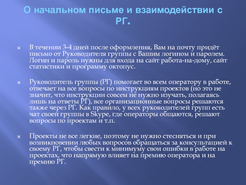 с Вашим логином и паролем. Логин и пароль нужны для входа на сайт работа-на-дому, сайт статистики и программу октопус.Руководитель группы (РГ) помогает во всем оператору в работе, отвечает на все вопросы по инструкциям проектов (но это не значит, что инструкции совсем не нужно изучать, полагаясь лишь на ответы РГ), все организационные вопросы решаются также через РГ. Как правило, у всех руководителей групп есть чат своей группы в Skype, где операторы общаются, решают вопросы по проектам и т.п.