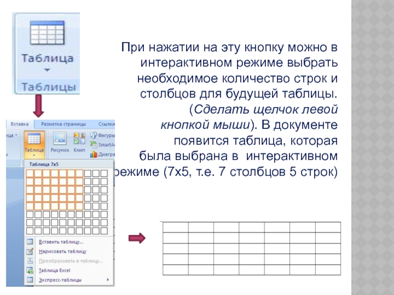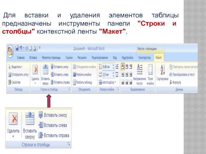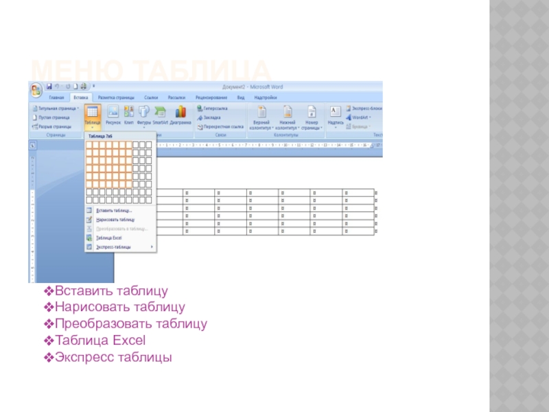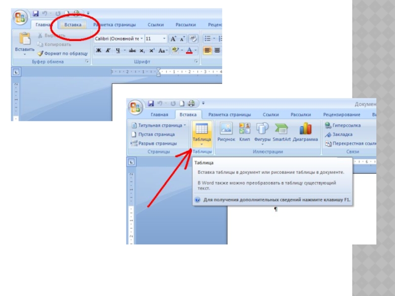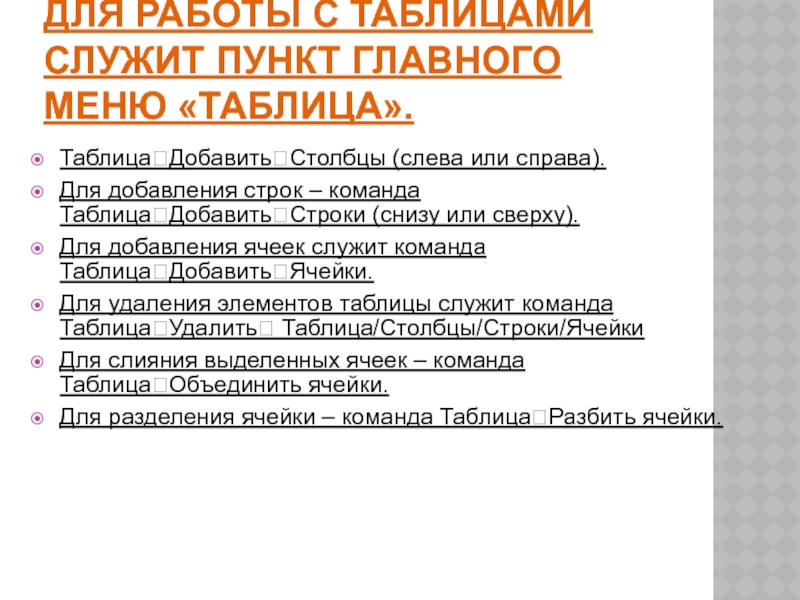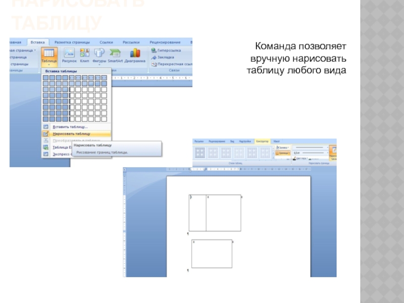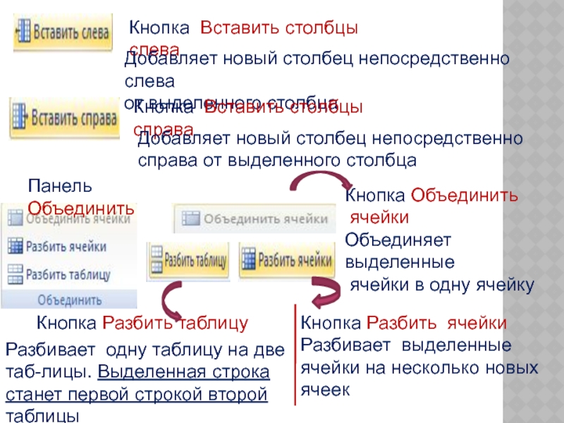 Разбивает одну таблицу на две таб-лицы. Выделенная строка станет первой строкой второй таблицы