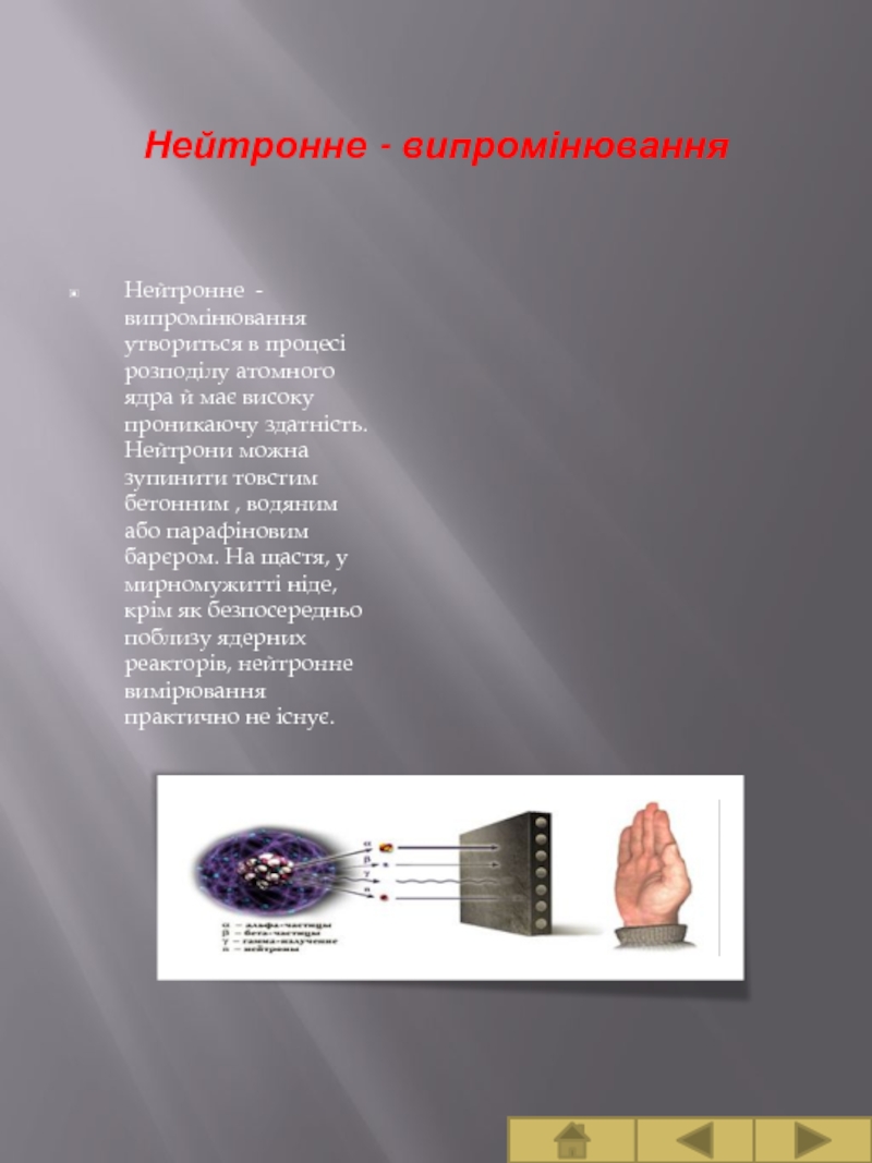 ядра й має високу проникаючу здатність. Нейтрони можна зупинити товстим