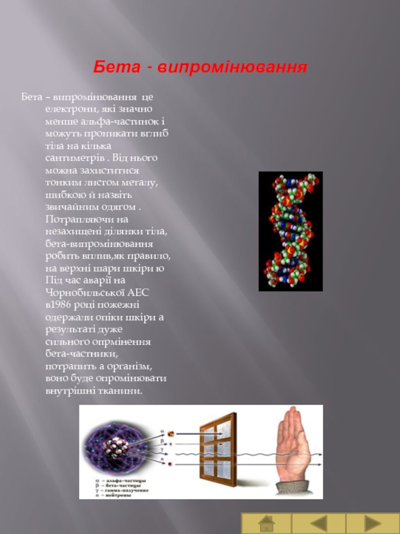 Від нього можна захиститися тонким листом металу, шибкою й назвіть звичайним одягом . Потрапляючи на незахищені ділянки тіла, бета-випромінювання робить вплив,як правило, на верхні шари шкіри ю Під час аварії на Чорнобильської АЕС в1986 році пожежні одержали опіки шкіри а результаті дуже сильного опрмінення бета-частники, потрапить а організм,воно буде опромінювати внутрішні тканини.