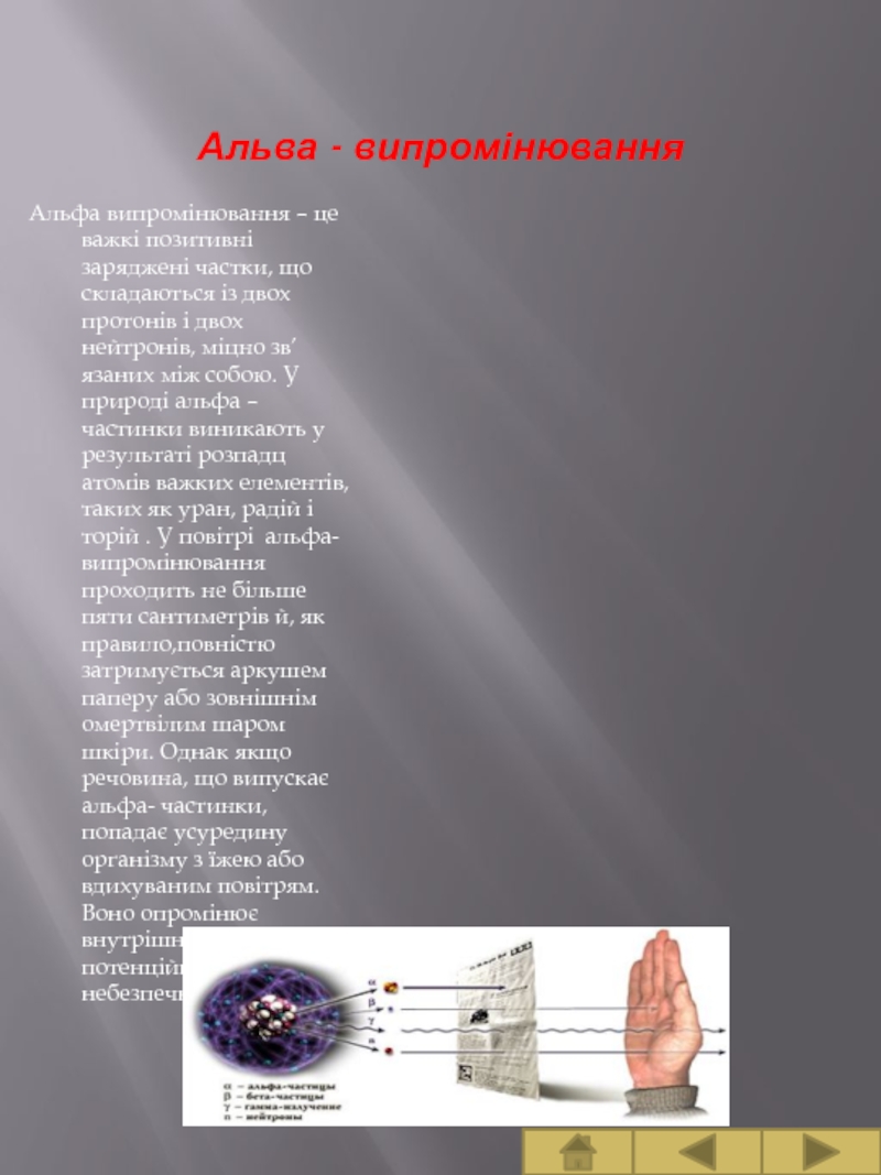 між собою. У природі альфа – частинки виникають у результаті розпадц атомів важких елементів,таких як уран, радій і торій . У повітрі альфа- випромінювання проходить не більше пяти сантиметрів й, як правило,повністю затримується аркушем паперу або зовнішнім омертвілим шаром шкіри. Однак якщо речовина, що випускає альфа- частинки, попадає усуредину організму з їжею або вдихуваним повітрям. Воно опромінює внутрішні органи й стає потенційно небезпечним.