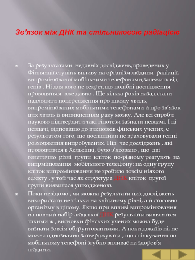 . Ні для кого не секрет,що подібні дослідження проводяться вже давно . Ще кілька років назад стали надходити попередження про шкоду хвиль,випромінюваних мобільними телефонами й про зв’язок цих хвиль із виникненням раку мозку. Але всі спроби науково підтвердити такі гіпотези зазнали невдачі. І ці невдачі, відповідно до висновків фінських учених, є результатом того, що дослідники не враховували генні розходження випробуваних. Під час досліджень , які проводилися в Хельсінкі, було з’ясовано , що дві генетично різні групи кліток по-різному реагують на випрмінювання мобільного телефону: на одну групу кліток випромінювання не зробило зовсім ніякого ефекту , у той час як структура ДНК кліток другої групи виявилася ушкодженою.