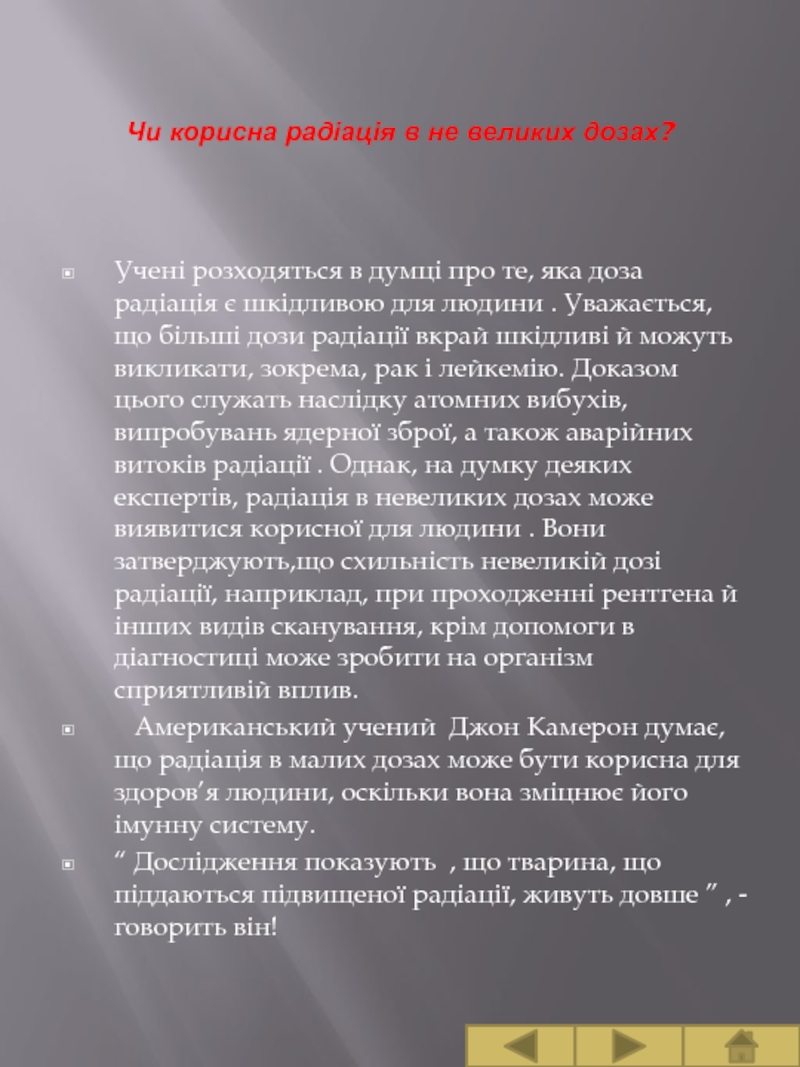 Американський учений Джон Камерон думає, що радіація в малих дозах може бути корисна для здоров’я людини, оскільки вона зміцнює його імунну систему.