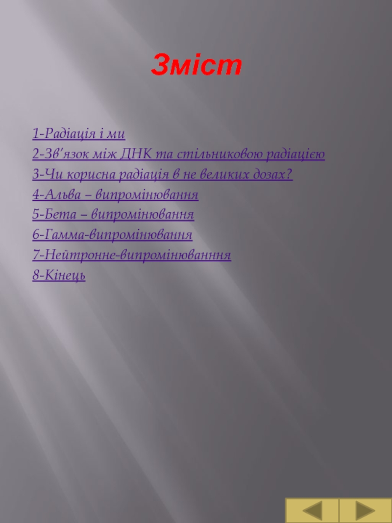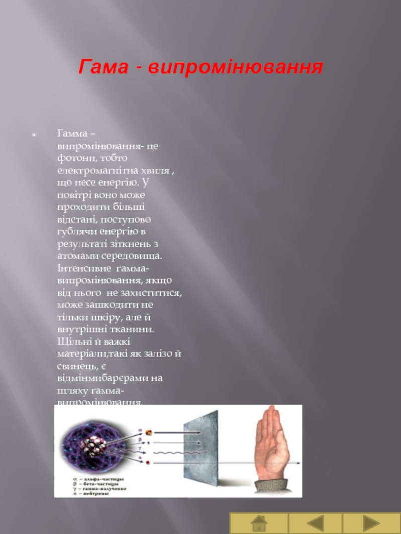 відстані, поступово гублячи енергію в результаті зіткнень з атомами середовища. Інтенсивне гамма- випромінювання, якщо від нього не захиститися, може зашкодити не тільки шкіру, але й внутрішні тканини. Щільні й важкі матеріали,такі як залізо й свинець, є відмінмибарєрами на шляху гамма- випромінювання.