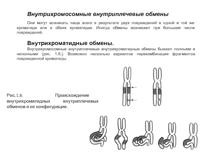 Внутрихромосомные внутриплечевые внутрихроматидные обмены бывают полными и неполными (рис. 1.8.). Возможно несколько вариантов перекомбинации фрагментов поврежденной хроматиды.