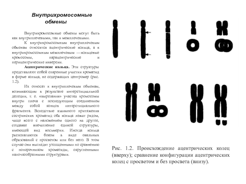 К внутрихромосомным внутриплечевым обменам относятся ацентрические кольца, а к внутрихромосомным