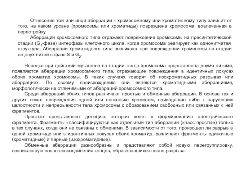 Аберрации хромосомного типа отражают повреждение хромосомы на пресинтетической стадии (G1-фаза) интерфазы клеточного цикла, когда хромосома реагирует как однонитчатая структура. Аберрации хроматидного типа возникают при повреждении хромосомы на стадии ее двух нитей в фазе S и G2.