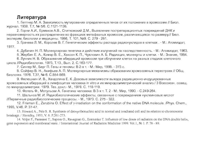 12. Frisman E., Zarubina O. Effect of -irradiation on the conformation of the native DNA molecule. /Phys. Chem., 1993, V.46. P. 37-47.