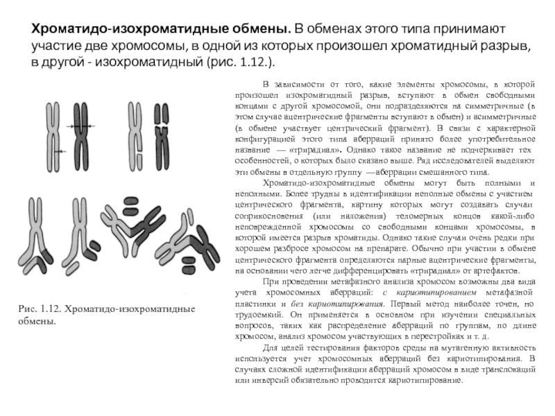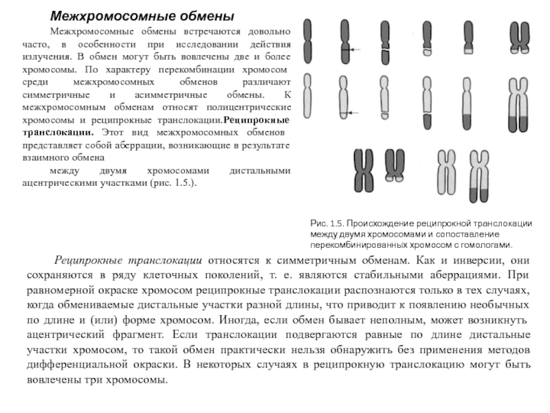 хромосомы. По характеру перекомбинации хромосом среди межхромосомных обменов различают симметричные и асимметричные обмены. К межхромосомным обменам относят полицентрические хромосомы и реципрокные транслокации.Реципрокные транслокации. Этот вид межхромосомных обменов представляет собой аберрации, возникающие в результате взаимного обмена