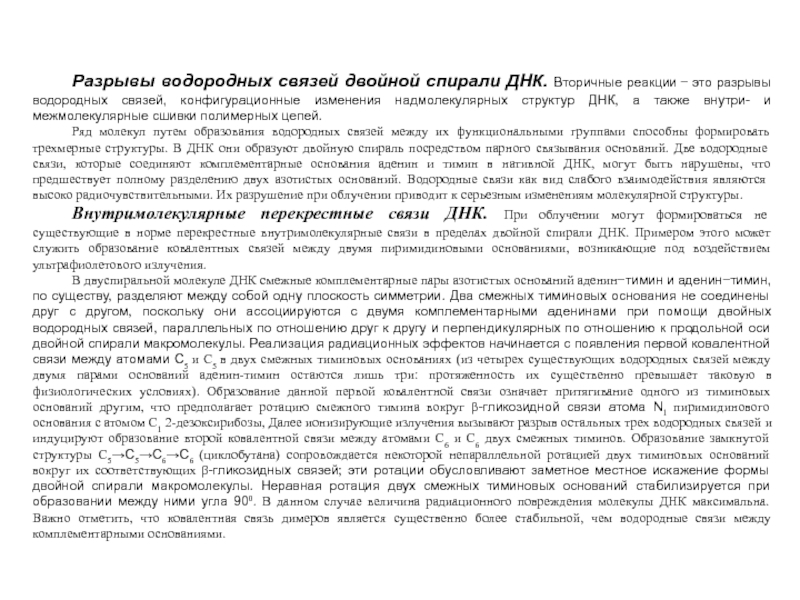 Слайд 32Разрывы водородных связей двойной спирали ДНК. Вторичные реакции это разрывы водородных