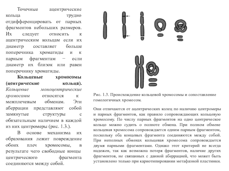 Они отличаются от ацентрических колец по наличию центромеры и парных фрагментов, как правило сопровождающих кольцевую хромосому. По числу парных фрагментов на одно центрическое кольцо можно судить о полноте обмена. При полном обмене кольцевая хромосома сопровождается одним парным фрагментом, поскольку оба концевых фрагмента соединяются между собой. При неполных обменах кольцевая хромосома сопровождается двумя парными фрагментами. Однако этот критерий не всегда надежен, так как возможна потеря фрагментов, наличие других фрагментов, не связанных с данной аберрацией, что может быть установлено только при кариотипировании метафазной пластинки.